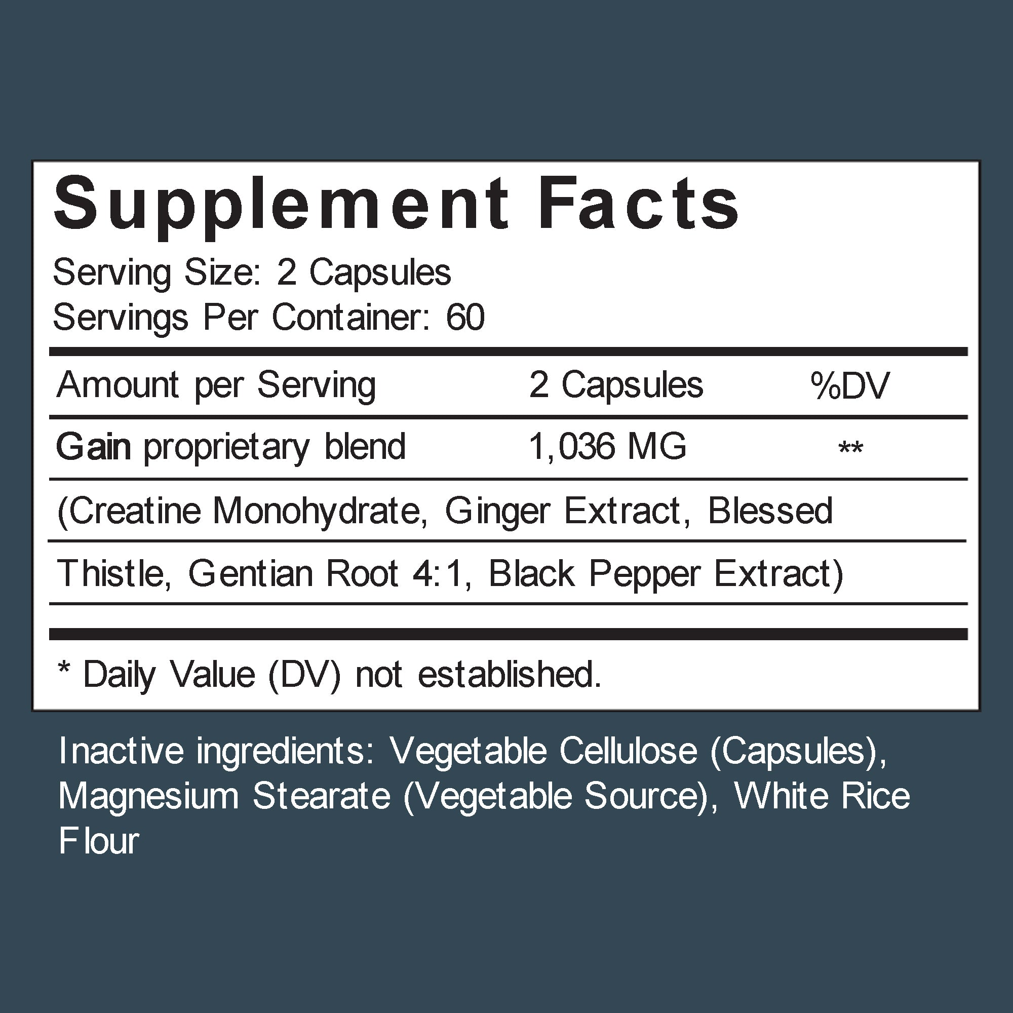 Creatine monohydrate, ginger extract, blessed thistle, gentian root, black pepper extract.